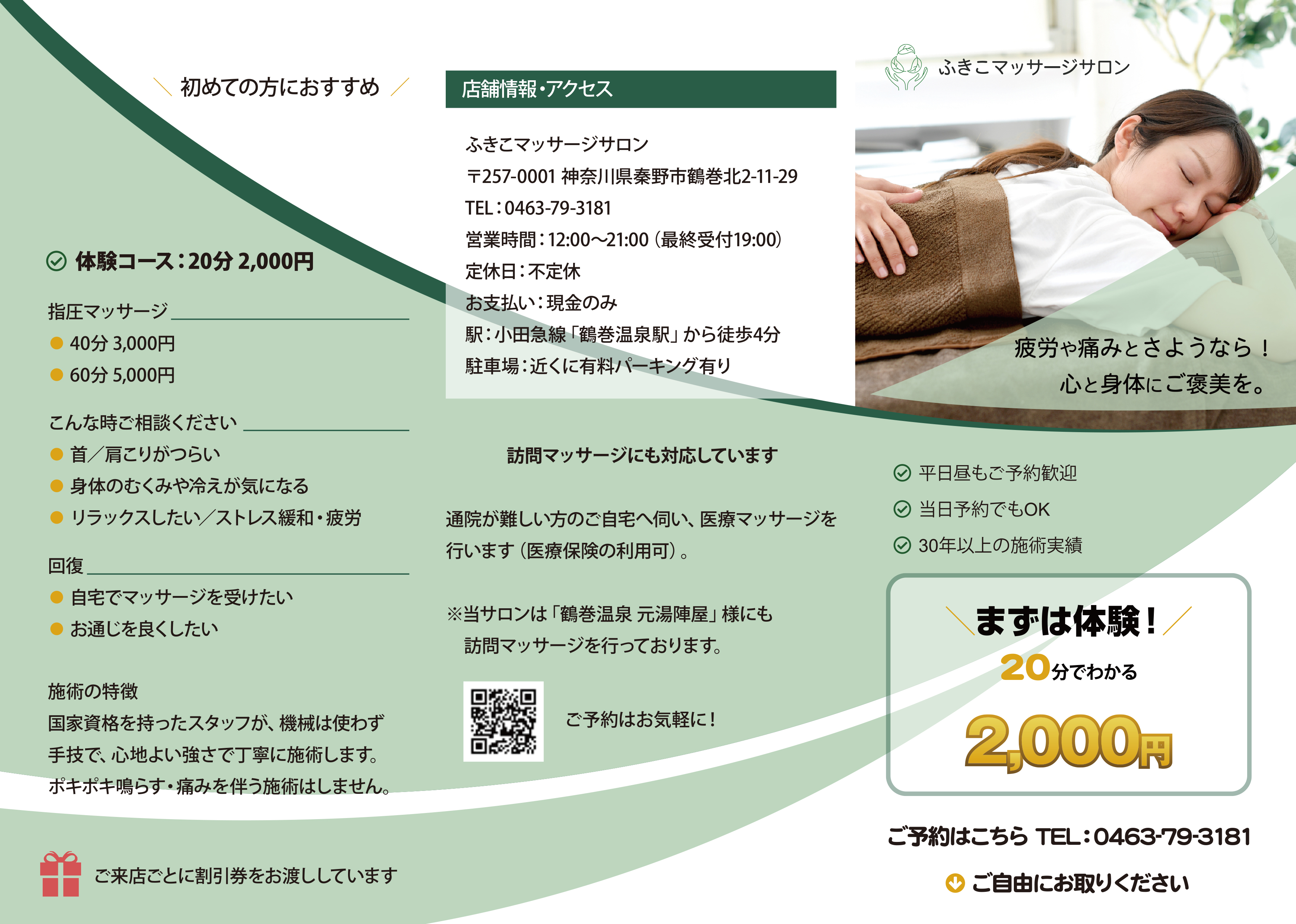 ふきこマッサージサロンは、お客様の身体の不調を改善するお手伝いをしております。